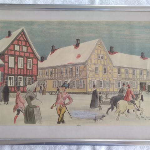 Raadhusgaden 26 litografi av Arne Johnson. Bildet har enkel gullramme med bruksmerker. Bildet er 43 cm x 53 cm. Selges for 150 kroner.
