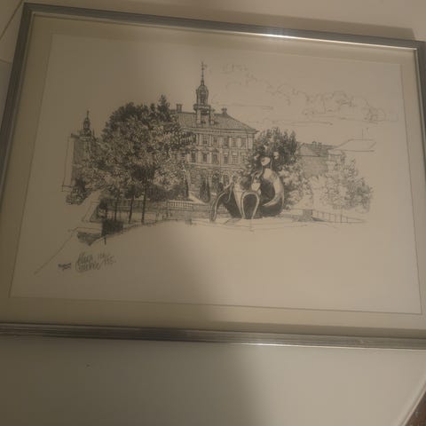 Dronningsgate 15 litografi av Arne Johnson. Bildet er i en enkel gullramme med noen skraper. Bildet er 43 cm x 53 cm. Selges for 150kroner.