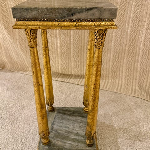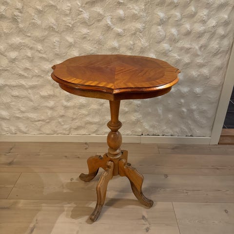 Sidebord i tre med buede ben. Bordet har rektangulær bordplate med synlig trestruktur og naturlige åremønstre. Benene er slanke og svakt utsvingte, noe som gir bordet et klassisk preg. Egner seg som lite avlastningsbord eller lampebord i stue, gang eller soverom.
