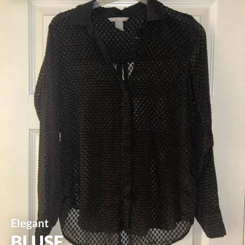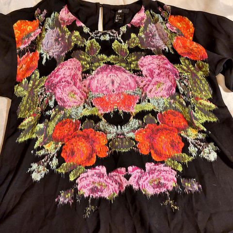 Nydelig bluse med broderier og volanger. Lukking med knapp i nakken. Str. 34.