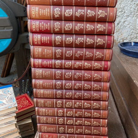 Norges historien i 15 bind. Noen av omslagene er ødelagt. (Se bilder). Fjerner man omslaget, fremstår bøkene som nye og uleste. Selges helst samlet.