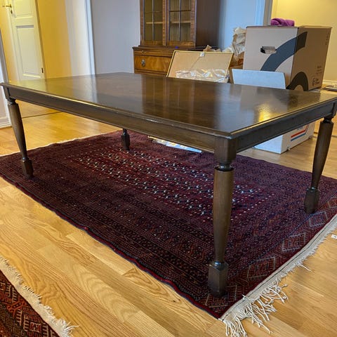 Selger et vakkert, stort salongbord i klassisk vintagestil. Bordet har solide materialer og et tidløst design som passer perfekt til både retro og moderne interiør.