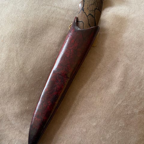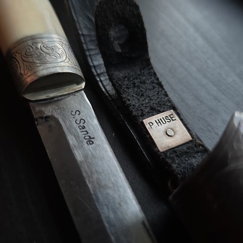 Fra serien "Valnøtt" av trekunstner Ulf Andersen. Laget i Andersens verksted i Ytre Enebakk. En egenartet gave til en brannmann? Brannøksen heves for å felle ut pennetuppen og heves igjen for å felle den inn.