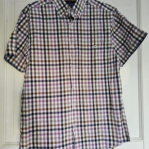 Klassisk kortermet skjorte med ruter fra Dressmann. Skjorten har knapper foran og på kragesnippene, samt brystlomme med knapp. Rød, blå, grønn og hvit i et småmønstret rutete design som passer både til hverdags og litt penere anledninger.