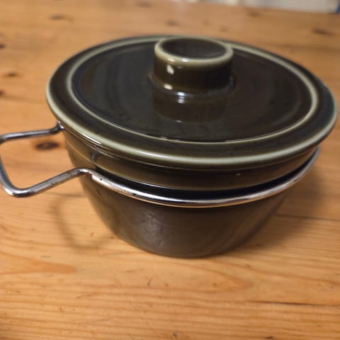 Porselensgryte i olivengrønn farge med ører i metall selges fordi jeg ikke bruker den og den tar vare opp plass. Se de siste to bildene for bruksmerker.