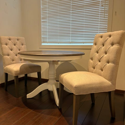 Solid kjøkkengruppe med klaff(30cm) kan bli mindre om klaff tas ut, med 6 stoler, trekk på stolene er byttet. Kjøpt i vintage stil. Solid bygget og flotte detaljer.selges grunnet flytting. Bud ønskes: NY PRIS‼️