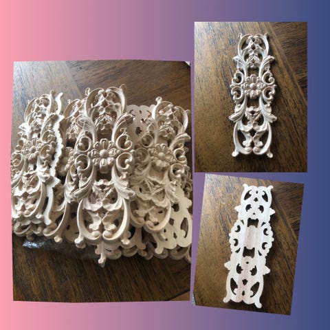Gjennombrutt ornamentikk i treverk / muligens trefinér ca 7 mm tykk.