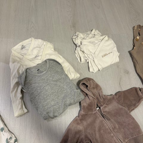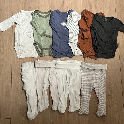 (Så et lite hull i en av buksene i str 74 etter bildene ble tatt. Også et lite hull i en hvit body str 56)