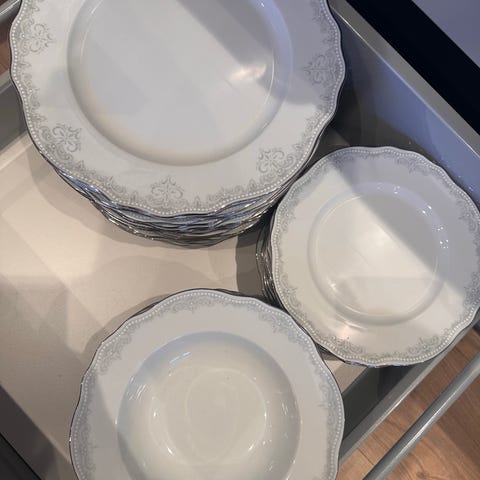 6 middagstallerkener, 6 frokosttallerkener, 6 suppe/pasta skåler, 6 kopper og 6 tefat