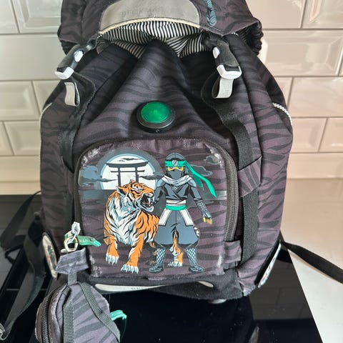Pent brukt skolesekk med alle glidelåser, lukkemekanismer og klemmer intakte.