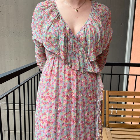 Kjolen har et romantisk og feminint uttrykk med delikat blomsterprint i pastellfarger, justerbare stropper og vakre blonde-detaljer. Lett og luftig stoff – perfekt til sommeren, bryllup, ferier eller hagefester!