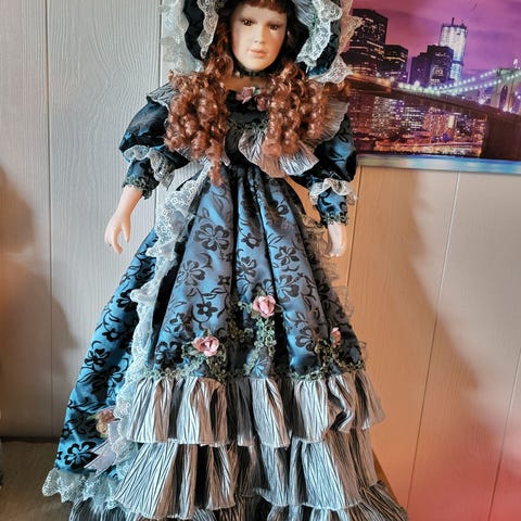 Porselen dukke med hvit og blå kjole