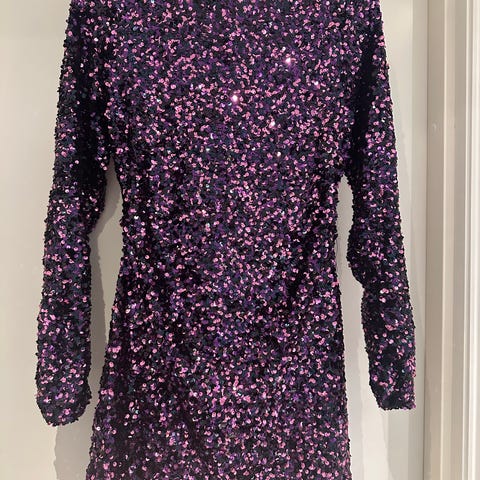 Pent brukt kjole fra Oasis i str XS/S. Perfekt til bryllup eller en annen anledning. Splitt i siden og strikk under belte (som kan reguleres), dyp blå farge.