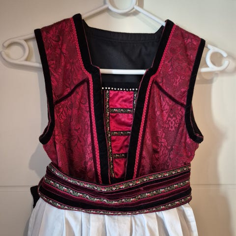 Hjemmelaget bunad/festdrakt til jente. Livet er noe regulerbart og kan justeres med knapper. Belte og skjørt er i ett og festes med borrelås.
