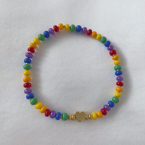 Håndlaget ørepynt i regnbuefarger med røde hjerter selges. Glassperler / rocaillesperler.