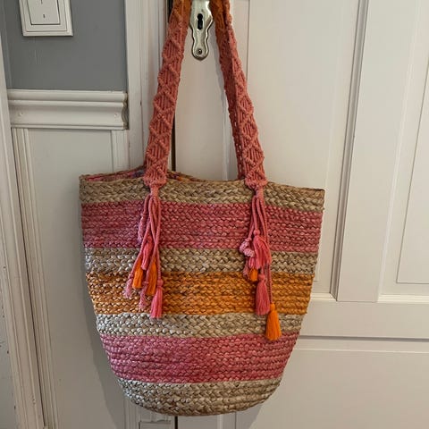 Fin veske i burgunder stoff med gullpaljetter og rosa broderi. Lukkes med glidlås med dekorativ dusk. Skulderrem i metall kan tas av slik at vesken kan brukes som clutch.