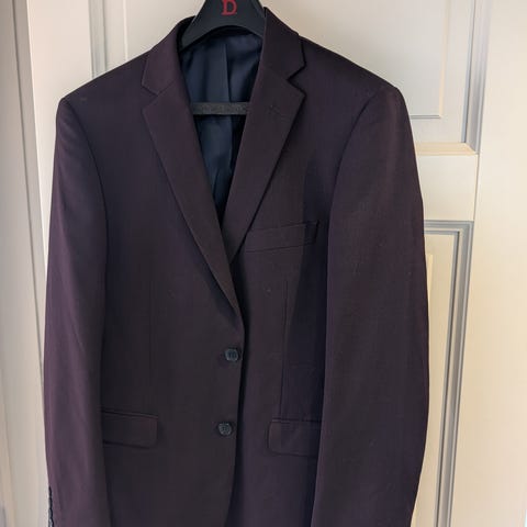 Unik rødbrun dress i pent stoff. Jakken er i str. 44. I buksa står det str. 46 (beina er 70 cm målt fra skrittet). Dressen er skreddersydd i Buchuresti ved en fin skredderforretning.