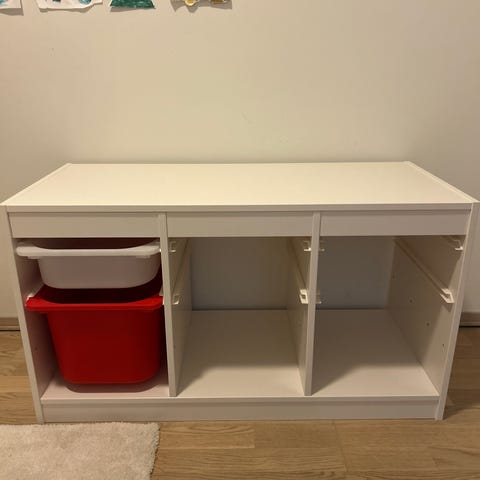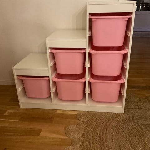 Fint brukt, trofast oppbevarings hylle. Følger med to hyller og 5 kasser. Kassene kan kjøpes på Ikea.