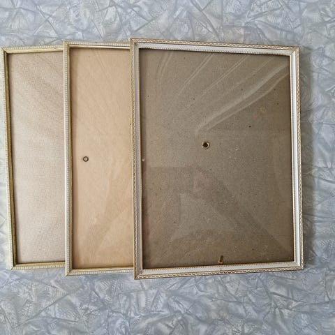 Tre identiske treverksrammer i målene 11 x 16 cm selges videre. Fremstår ubrukt.