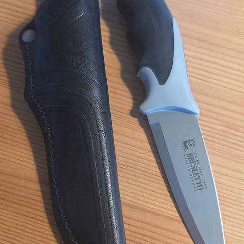Robust jaktkniv i rustfritt stål og med blad godt egnet for jakt. Orange nylon grep gjør kniven synlig. Solid slire i kraftig nylonweb. En god jaktkniv. Bladlengden 8,5 cm, total lengde 20,5 cm. Porto kr 80,- kommer i tillegg.