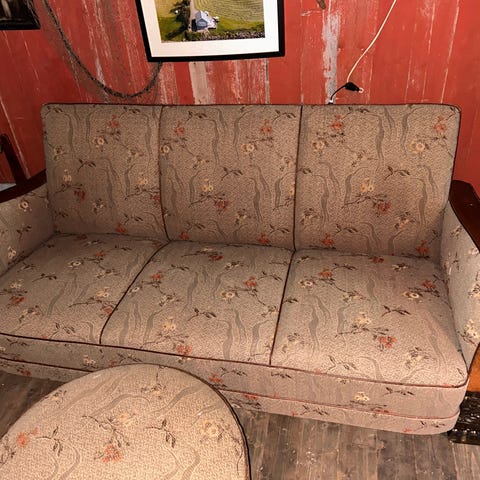 Denne er trukket om i et burgunder fløyelslignende stoff. Stoffet ligner på det som var originalt på sofaen.