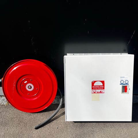 Skap for oppbevaring av 6kg brannslukningsapparat. Med pakning slik at vann ikke kommer inn om det er montert ute.