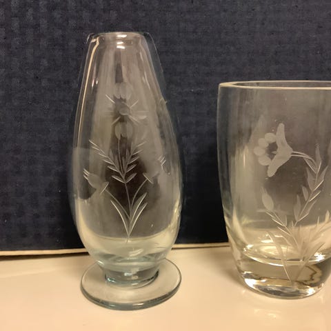 Nydelige små glasskåler i ravfarget pressglass og en rosa vase selges kr 90pr stk