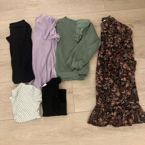 Liten klespakke med kjole fra Zara 134, slengbukse fra H&M 134, og genser fra Lindex 134/140.