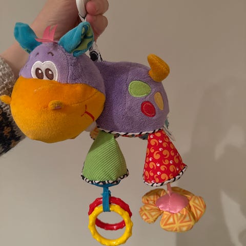 Den kan enkelt festes til en barnevognbøyle, bilstol eller barneseng.