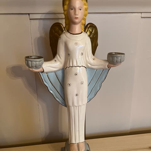 Det er et ørlite nag på kanten og noen brune flekker I glasuren. Ellers er den hel og fin med noen bruksmerker I form av noen riper i dekoren