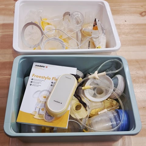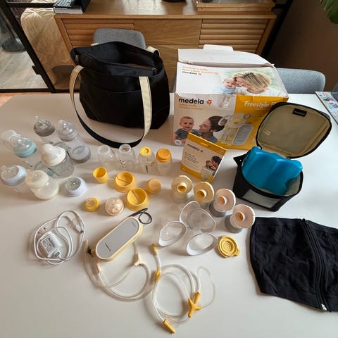 Utstyret er kjøpt nytt, men det er brukt i ett helt år. Brystpumpen lader seg ikke helt opp lenger og stopper på to av tre mulige streker. Den fungerer fortsatt, men videre levetid er usikkert, både for pumpen og for utstyret ellers.