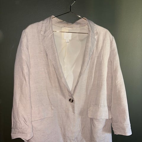 Sandfarget blazer i viskose/lin str M. Passer perfekt til meg som er 180 cm med lange armer. Litt innsving, men avslappet stil. Mellomlang. 67% viskose og 33% lin. Kun brukt en gang i bryllup.