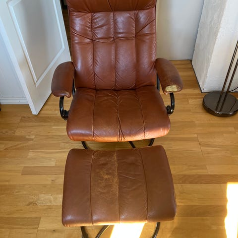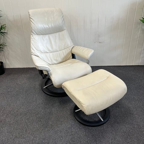 Stressless lenestol med fotskammel i beige skinn. Lenestolen har høy rygg med integrert nakkestøtte og polstrede armlener. Understell i metall med rund fot gir stabilitet. Fotskammelen har matchende skinn og metallunderstell. Egnet som hvilestol i stue eller lesehjørne.