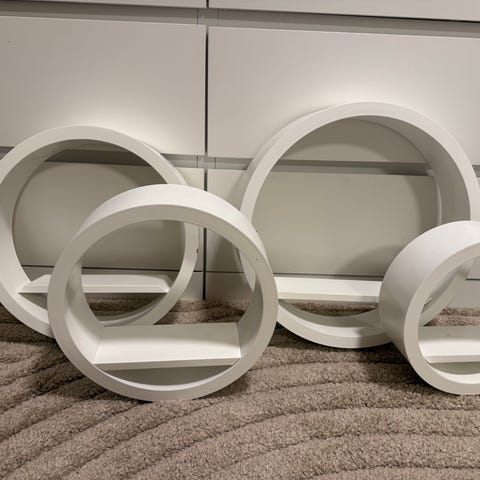 4 stk kvadratiske bokshyller i hvit, glatt utførelse. Tunge og solide, god kvalitet. Fleksible. Kan henges på vegg, brukes enkeltvis eller stables.