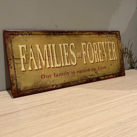 Skilt med tekst - Her bor slitne foreldre og lykkelige barn