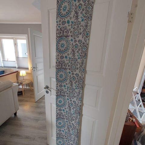 Gardinen kan trekkes sammen eller helt ut til 240 cm med et pent design på gardinen