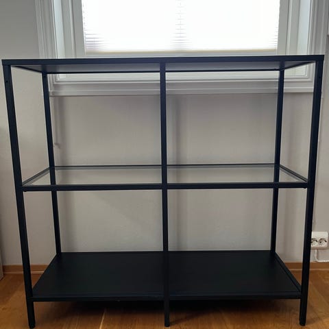Det enkle designet og glasshyllene gjør at tingene du er glad i synes godt. Topp- og bunnplatene er brunsvarte på den ene siden og svarte på den andre, slik at du kan velge uttrykket som passer deg.
