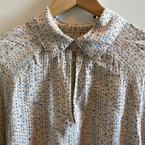 Tøff topp fra APOF i seersucker bomull. Ruter i blått og gult. Litt lengre modell med fin krage og lange mansjetter. Str 38/M.