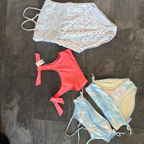 Brukt en sesong av et barn. En badedrakt med lange armer og to stk bikini. Underdeler til bikini følger med om ønskelig.