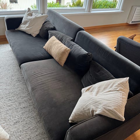 Merk: Det er en liten synlig skrue bak som har laget en svak rift i stoffet bak sofaen. Dette synes ikke forfra og påvirker ikke bruken.