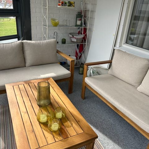 Jeg selger en sofa og et bord . En pute har skade på men puten putene er IKKE falmet i solen . Bord har bruksmerker på platen.