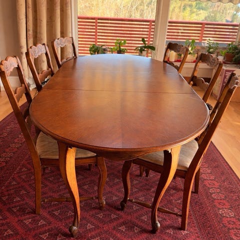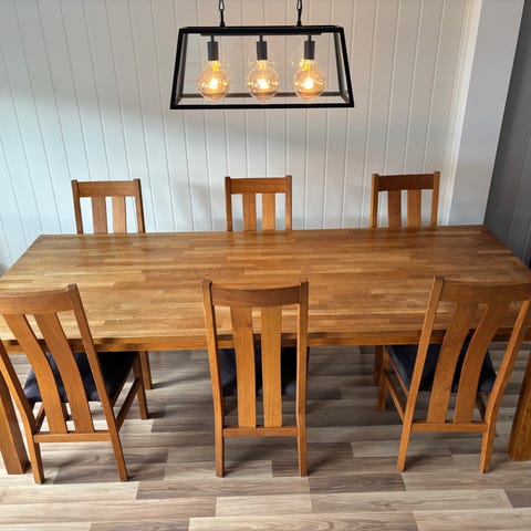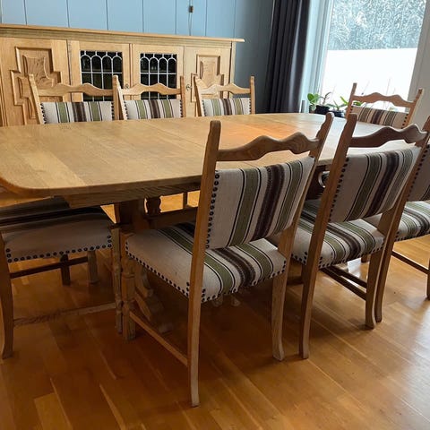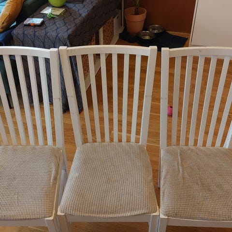 Den øverste bøylen trenger å limes på noen av stolene og det er noen flekker, regner med de fleste blir borte etter vask.