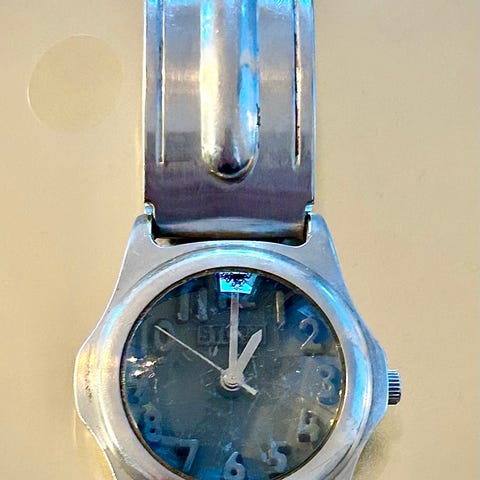 — Tilstand: urene er ikke testet, kan være defekt – selges kun for deler, ingen garanti. Remmen «Genuine Leather» er sterkt slitt.