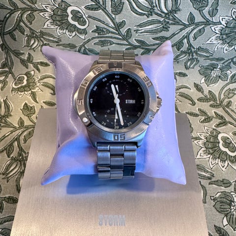 — Merke: STORM London (modell med skinn-/siliconrem, japansk urverk), rustfritt stål kasse.