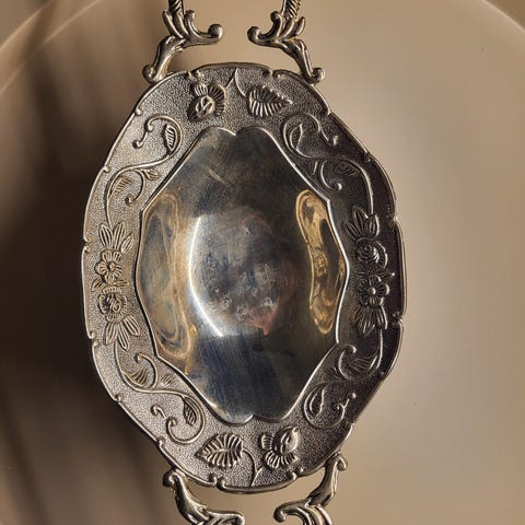 Stor skål i sølvfarget metall. Minner om sølvplett, men mulig det er tinn. Usikker.