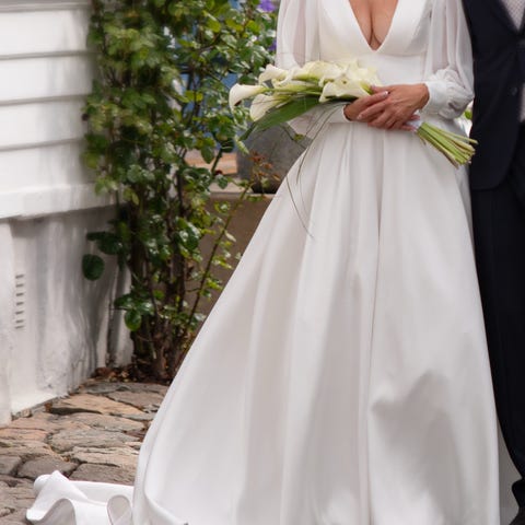 Kjolen har et tidløst, romantisk snitt som fremhever midjen og skaper en elegant silhuett. Med de avtagbare ermene kan du velge mellom et klassisk og et mer moderne uttrykk – perfekt både til vielsen og festen. Personlig syns jeg splitten og lommene fullførte kjolens ‘look’. Splitten var spesielt fin å ha i sommerbryllup!