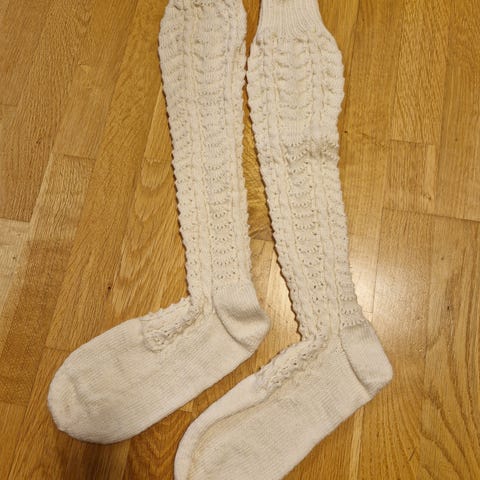 Det er strikket inn forsterkingstråd i hælen for mindre slitasje under. Ukjent alder. Fremstår lite brukt.