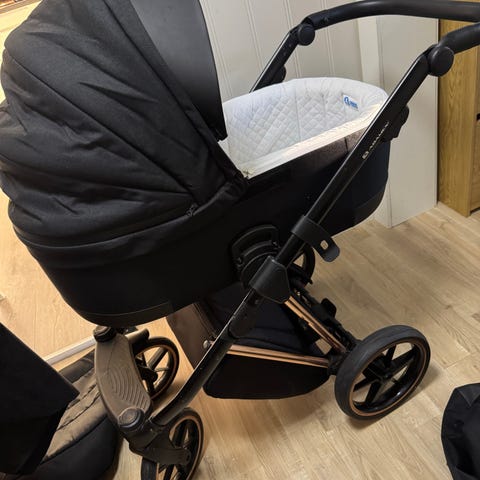 Barnevognen er i god stand, brukt kun 7 måneder. Settet inneholder: to regnfrakker, to myggnett, to store og små vesker, en sovepose fra produsenten, et stelleunderlag, en koppholder, det er også adaptere for bilsetet fra produsenten Cybex.