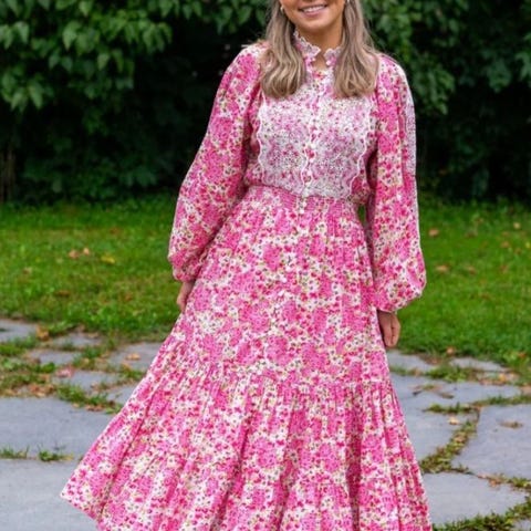 Lekker bytimo kjole i lekre farger ,Nydelig design på armer,kjolen er brukt kun en gang. Kjolen er litt tøyelig pga strikk bak:) jeg er 165 cm høy og er forlangt,har fikset lengden hos skredder:) frakt kommer i tillegg. Ingen retur:)