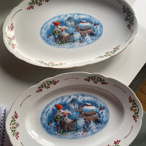 2stk store boller,2stk mikke mus t-lys,2stk store fat,4stk store kaffe krus, 12 stk dessert boller,12stk store tallerken, 12stk frokost tallerken, 12 stk middag glass.ligger i original esker ikke brukt bare oppnet for å se at alt var i orden.